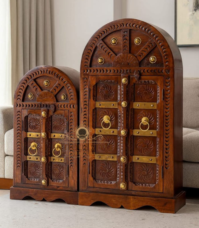 Showcasing a majestic arched top reminiscent of vintage palace doorways, the cabinet features intricate brass detailing, decorative rings, and richly carved patterns that create an aura of heritage elegance. With its deep mahogany finish, solid build, and functional storage space behind double doors, this piece serves beautifully as a bedside table, end table, or accent cabinet—adding character and cultural charm to any setting.