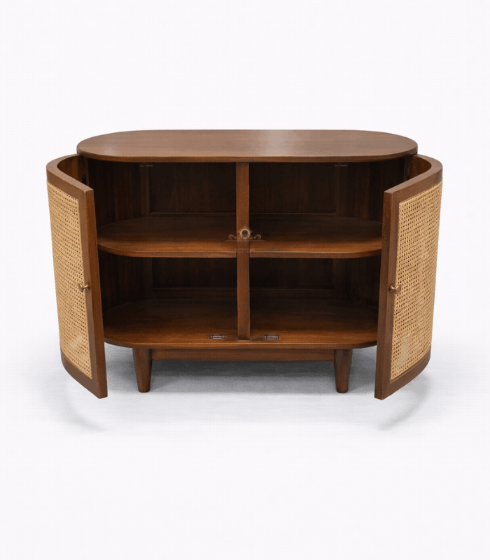 • Four-Door Cane Artistry: Showcases four large cabinet doors inlaid with high-quality woven cane, offering a unique textural contrast and a breathable design for electronic components.