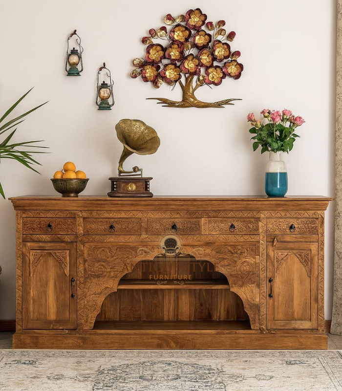 This magnificent sideboard captures classic Indian architectural elegance with its beautifully carved central arched niche and solid wood craftsmanship. Finished in a warm natural tone, it offers a stunning blend of display and storage. With spacious side cabinets, upper drawers, and ornate detailing, it becomes a versatile and striking focal piece for living rooms or dining spaces.
