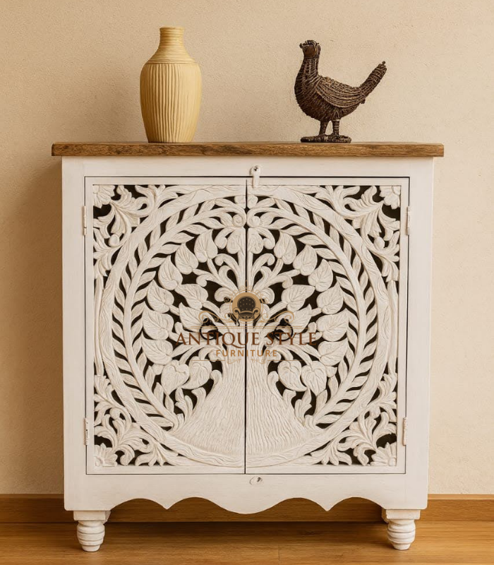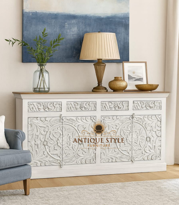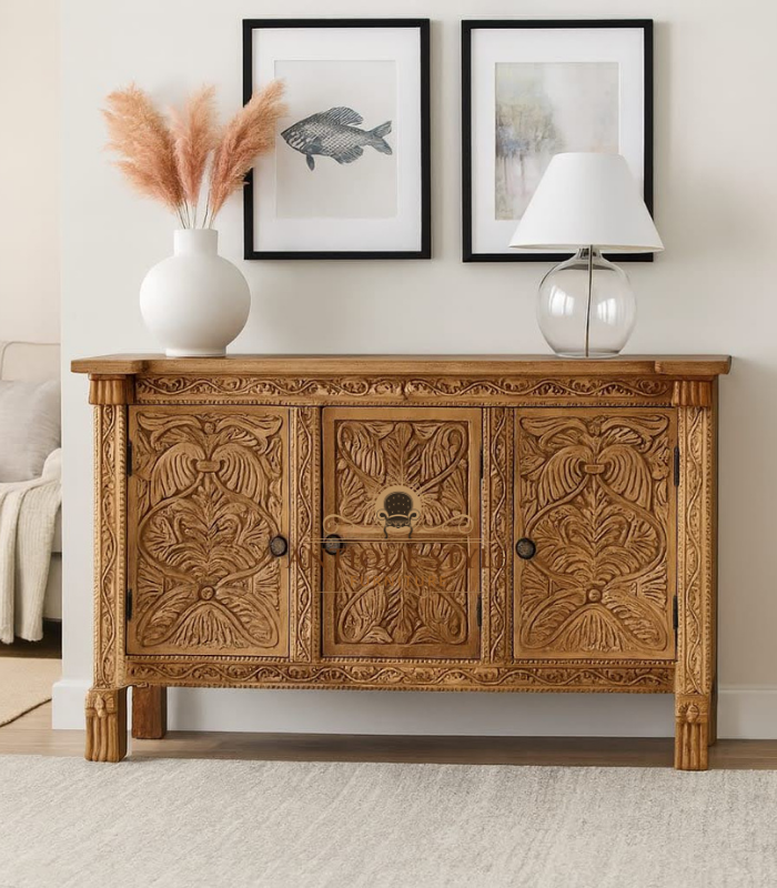 Extensive Side Storage: Two spacious side cabinet doors with subtle carving and elegant pull handles.