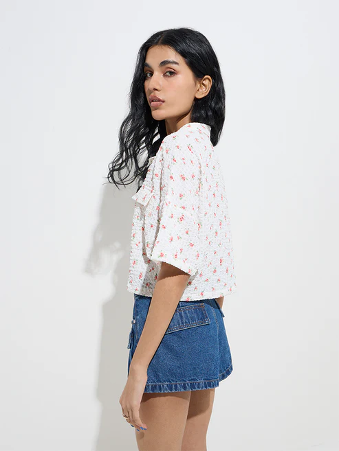 Nuon White Floral Patterned Smocked Shirt