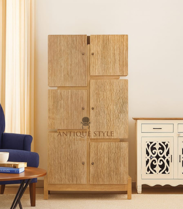 Wooden Cube Cabinet combines modern design with functional storage, adding a touch of organic texture to any space. Its six textured door panels, resembling natural wood grain or bark, create a contemporary rustic appeal, while the solid wood frame ensures stability. With a modular grid of compartments and subtle wooden knobs, it offers versatile vertical storage for books, linens, or décor, perfectly suited to Modern, Scandinavian, or Minimalist interiors.